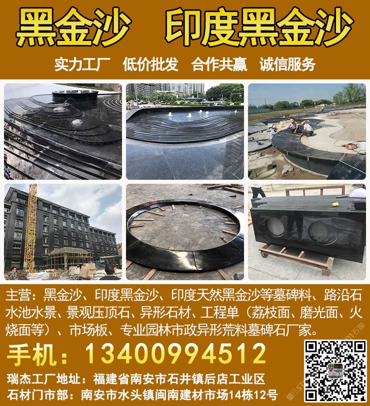 瑞杰黑金沙林總13400994512專業(yè)印度黑金沙供應(yīng)商,實(shí)力石材工廠主要加工:黑金沙、黑金砂、印度黑金沙、印度天然黑金沙、印度黑色石材、印度黑石、黑金沙石材、黑金沙花崗巖、新礦黑金砂、國(guó)產(chǎn)黑金沙、新黑金沙石材等墓碑料、路沿石、水池水景、景觀壓頂石、異形石材、工程單(荔枝面、磨光面、火燒面等)、市場(chǎng)板、專業(yè)園林市政異形荒料墓碑石廠家,實(shí)力工廠、低價(jià)批發(fā)、合作共贏、誠(chéng)信服務(wù). 工廠地址:福建省南安市石井鎮(zhèn)后店工業(yè)區(qū),門市部:南安市水頭鎮(zhèn)閩南建材市場(chǎng)