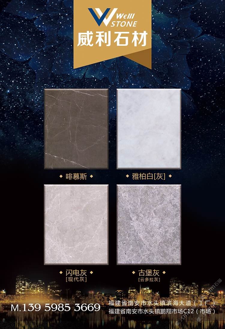 南安市威利石材有限公司成立于2008年,是一家集礦山開采、加工、銷售、工程設計施工、進出口貿易為一體的綜合型企業(yè)。我們不僅提供石材,更為您精心設計全套優(yōu)質的石材解決方案。 威利石材專注于石材產品的礦山荒料直銷、大板加工、大板展銷、工程設計、工程配套施工服務 。公司主營啡慕斯、黑白根、塞浦路斯灰、古堡灰,愛馬仕灰(溫德姆灰),雅柏白,閃電灰多種優(yōu) 質品種。公司已成為一家集專業(yè)化、產業(yè)化和規(guī)模化的工程材料采購、加工配套服務商。 威利石材以自己多年專業(yè)化和國際化的經營,與國內外礦山建立了良好的商業(yè)信譽和經貿合作關 系,贏得了國外礦山在中國區(qū)營銷戰(zhàn)略的全力支持。 威利石材依靠豐富的礦山資源,先進的管理、施工經驗,堅持“以市場為導向、以技術為主體、 以質量為命脈、以效益為中心”,大膽探索,在技術進步、生產經營、企業(yè)管理、產品質量、售后服務等 方面始終走在行業(yè)的前列。并在信守“質量為準、信譽優(yōu)等、服務為上”的企業(yè)精神指導下,產品暢銷世 界各地,深得消費者的信賴和贊譽。我們時刻把握時代脈搏,走在市場前沿,揮灑石材文化,增添人類輝煌。多年來我們一直致力于服務質量的提高?!邦櫩蜑樯稀?、“追求圓滿”已經融入到公司的企業(yè)文化、經營 理念當中,并且在產品生產、過程服務、售后追蹤等具體工作中得到落實。 我們的追求——集世界美石,為中國添彩!\
