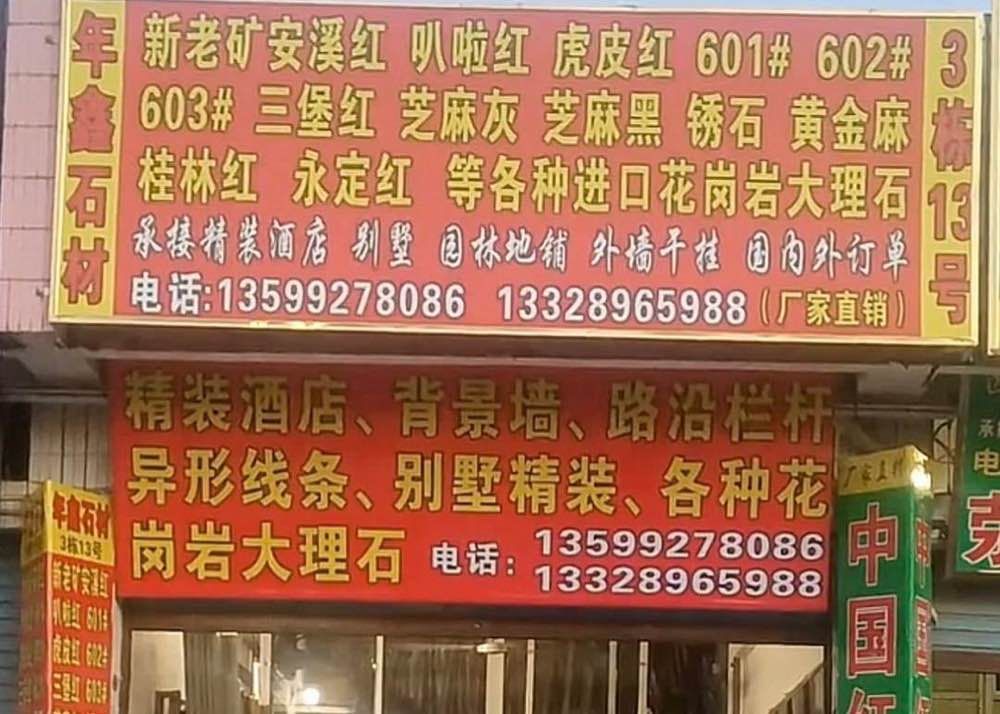 年鑫石材有限公司 聯(lián)系人:王金龍    135****8086 查看 135****8086 查看 主營(yíng)范圍: 花崗巖加工、異型加工、大理石加工、其他、 企業(yè)地址:福建泉州南安市水頭鎮(zhèn)閩南建材第一市場(chǎng)17棟5號(hào)