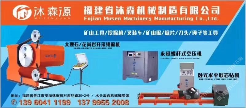 沐森機(jī)械 聯(lián)系人:尤    139****1199 查看 手機(jī)號(hào)碼:無(wú) 主營(yíng)范圍: 礦山、石材外貿(mào)、石材工程資質(zhì)企業(yè)、石材機(jī)械、石材輔料及特殊工藝、 企業(yè)地址:福建泉州南安市水頭鎮(zhèn)中國(guó)石材機(jī)械輔料交易中心