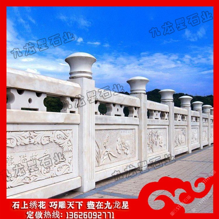 發(fā)布信息: 高速公路石雕護(hù)欄 花崗石欄桿加工廠家——九龍星石業(yè)。 花崗石欄桿加工廠家在設(shè)計(jì)的時(shí)候要規(guī)定尺寸,花崗巖石材的尺寸和規(guī)模決定了它的價(jià)格標(biāo)準(zhǔn) ,石欄桿廠家在加工欄桿的時(shí)候根據(jù)尺寸大小確定好花崗巖石欄桿的形狀,再將花崗 巖石欄桿制成不同的造型,這些造型目前可以分為歐式的、連續(xù)式的、寶瓶式的、簡(jiǎn) 易式的等等、這些造型可以的多樣性可以適用于任何場(chǎng)所中。 高速公路石雕護(hù)欄的制作造型采用橫檔以及花飾,石欄桿安裝的場(chǎng)所一般在河邊,護(hù)城河使用量 大,石欄桿制作雕刻亮點(diǎn)在于立桿的設(shè)計(jì),立桿的制作可以柱子成寶瓶柱或者花瓶柱 ,欄桿的制作根據(jù)不同地方的應(yīng)用在雕刻制作上的樣式上也不同。石欄桿的安裝在各 大建筑領(lǐng)域中應(yīng)用也很多,會(huì)有局部的鏤空形式,這種制作造型的石欄桿在景觀橋上 的使用頻率較多。 石雕欄桿作為橋上的扶手,主要是承擔(dān)兩個(gè)作用,一是便于游客手扶,二是防止行人 或者是機(jī)動(dòng)車墜入橋下,因?yàn)樗淖饔盟詮S家在制作的時(shí)候要按照對(duì)應(yīng)要求來(lái)進(jìn)行 制作。因?yàn)槿藗冏咴跇蛏系臅r(shí)候會(huì)手扶石雕欄桿,所以這就要求欄桿的表面要打磨的 相對(duì)舒適。