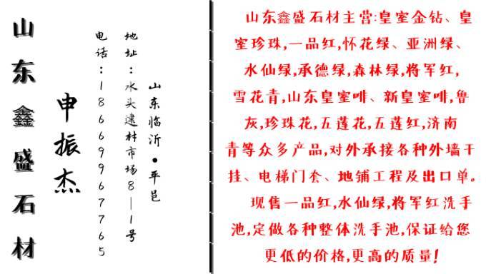 鑫盛石材 聯(lián)系人:申振杰    186****7765 查看 186****7765 查看 主營范圍: 大板批發(fā)、荒料、異型加工、花崗巖加工、石材外貿(mào)、 企業(yè)地址:山東臨沂臨沂市平邑縣北方石材城