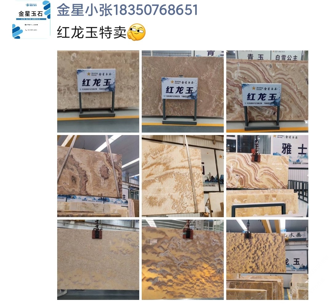 金星石業(yè)有限公司 聯(lián)系人:黃    152****2319 查看 183****8651 查看 主營范圍: 大板批發(fā)、荒料、大理石加工、石材交易市場、玉石加工、 企業(yè)地址:福建泉州南泰石材城H8