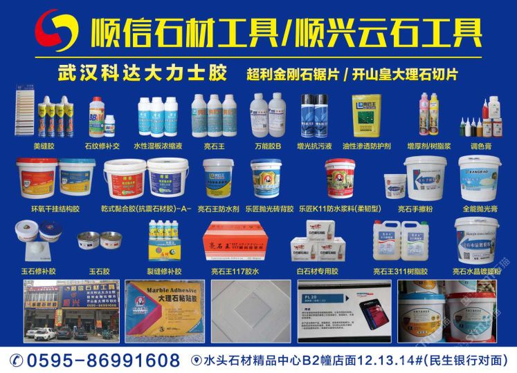 南安市順信石材工具有限公司(順興工具) 聯(lián)系人:黃先生    139****7770 查看 0595-****3608 查看 主營范圍: 石材輔料及特殊工藝、 企業(yè)地址:福建泉州南安市水頭鎮(zhèn)石材精品中心B棟12-14號