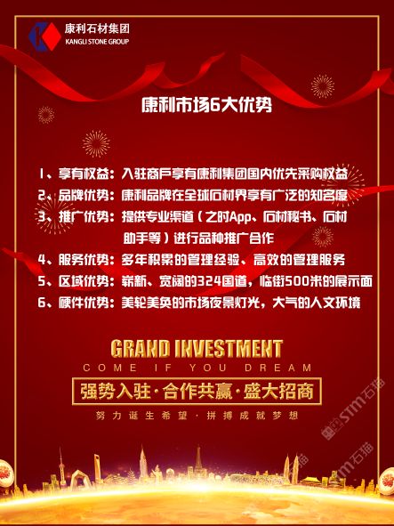 發(fā)布信息: 康利大板市場黃金三期盛大開業(yè),區(qū)域已重新規(guī)劃完成,啟動大板市場營銷新模式,現(xiàn)規(guī)模龐大,交通便利,性價比高,市場比往年更加火熱?,F(xiàn)架子位全面對外招租: 1、架子位租金100元/個起 2、免費(fèi)提供1間業(yè)務(wù)室 3、免費(fèi)提供石材品種推廣 4、提供激勵活動:月出庫量超出30架部分,免收吊裝費(fèi);月出庫量超出60架部分,額外獎勵5元/架;月出庫量超出80架部分,額外獎勵15元/架 5、市場費(fèi)用收?。貉b車費(fèi)30元/架,裝柜費(fèi)50元/架,電費(fèi)1元/度,免水費(fèi)。 詳詢請致電:13859744056(吳先生)或至康利大板市場招商部洽談。
