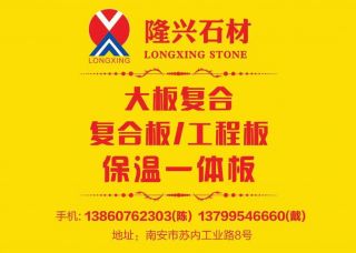 隆興復(fù)合板主營產(chǎn)品:復(fù)合板(保溫石材),復(fù)合板(大理石鋁蜂窩),復(fù)合板(大理石花崗巖復(fù)合),復(fù)合板(玉石玻璃),復(fù)合板(大理石瓷磚),復(fù)合板(超?。?復(fù)合板(奢石),透光復(fù)合板(光電奢石)企業(yè)地址:福建南安石井鎮(zhèn)蘇內(nèi)工業(yè)區(qū)8號